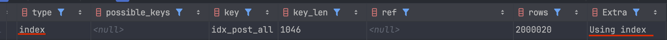 확인 결과 type이 ALL인 것을 확인했다. 이는 쿼리가 인덱스를 사용하지 않고 풀 테입블 스캔을 하고 있음을 의미한다.