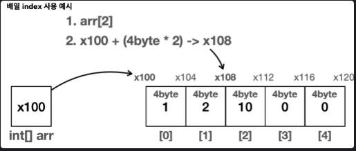 int는4byte를 차지한다 -> 따라서 배열의 시작 위치부터 시작해서 자료의 크기(4byte)와 인덱스 번호를 곱하면 원하는 메모리 위치를 찾을 수 있다.- 배열의 시작 참조 위치 + 자료의 크기 + 인덱스 위치 = 해당 연산을 통해 값이 나오게 되는데 그걸 토대로 값의 위치를 찾아온다.