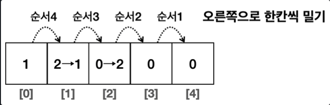 - 이때 배열의 끝 부분 부터 오른쪽으로 밀어야 데이터를 유지할 수 있다.