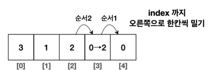 - 지정한 Index에 데이터를 추가할 위치를 확보해야 하기 때문에, Index부터 시작해서 데이터들을 오른쪽으로 한 칸 씩 밀어야 한다.